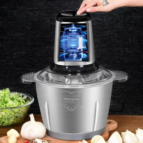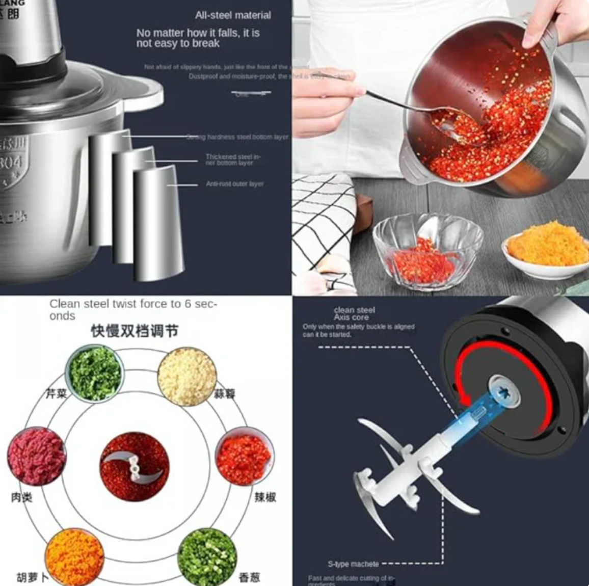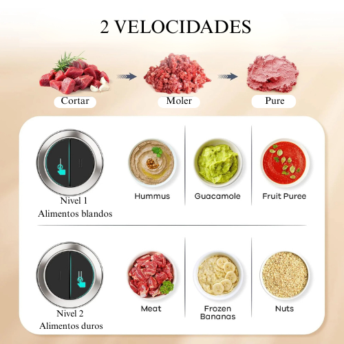 2 velocidades, acero inoxidable en sus cuchillas y recipientes, fácil lavado y triturado. FORMA DE USO: presiona por 15 a 20 segundos, luego deja enfriar el motor por el mismo tiempo, y utilízala nuevamente